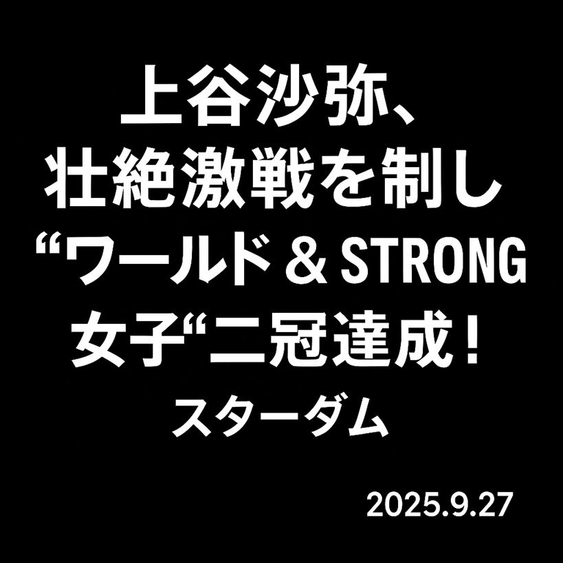 2025年9月27日、上谷沙弥が AZM を下し、スターダムの ワールド & STRONG女子 二冠王者 に輝いたこの瞬間は、歴史に刻まれる快挙だ。激闘の中で逆転を成し遂げた技術、粘り、メンタルは、彼女がただの強豪を超えて “頂点を張る資質” を持つことを証明している。