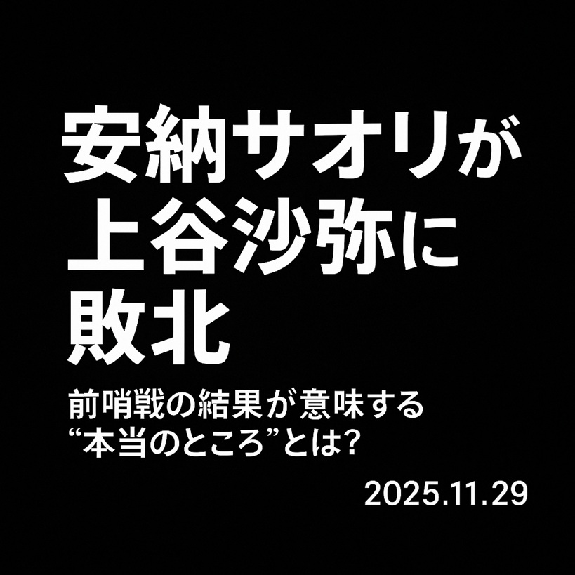 11.29大阪大会での安納サオリの敗北は、ただの一敗ではなく、今後のストーリーを大きく動かす非常に重要な意味を持つものでした。上谷沙弥は勢いある王者として存在感を見せ、挑戦者の安納サオリはこの敗北によって“挑む側”としての火がついた印象です。