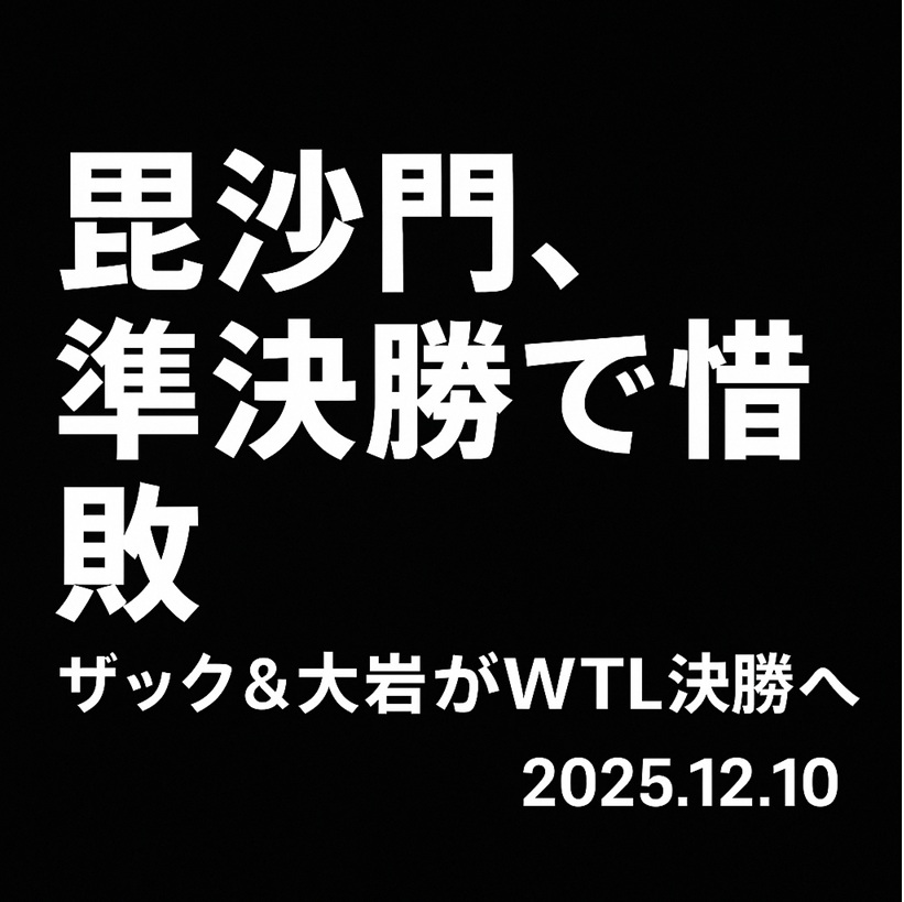 ザック・セイバーJr.&大岩陵平が毘沙門に勝利し決勝進出。POSTレストリング - 大岩のカオス・セオリーを起点に、ザックの押さえ込みで後藤を仕留める形が決定打。Slam Wrestling